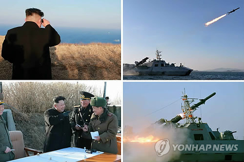 | △ 북한, 신형 함대함로켓 개발…김정은 시험발사 참관 (서울=연합뉴스) 북한이 최근 함선공격용으로 신형 반(反)함선 로켓을 개발해 실전 배치를 앞둔 것으로 드러났다. 북한은 지난 2012년 은하 3호 로켓을 발사한 후 3년여 만에 다시 장거리 공격용 로켓을 개발, 시험 발사에 들어갔다. 노동신문은 김정은이 새로 개발한 로켓의 시험발사를 참관했다고 7일 전했다. 로켓 시험발사 장면을 지켜보는 김정은. 2015.2.7 nkphoto@yna.co.kr |