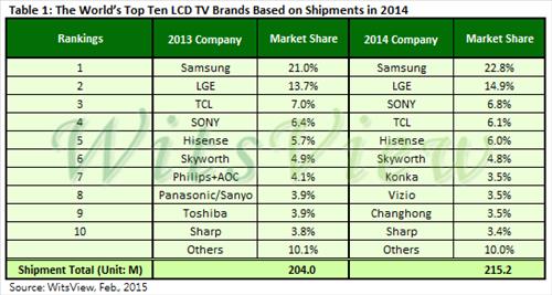 지난해 LCD TV 시장 집계 결과…10위권 내 중국업체가 절반