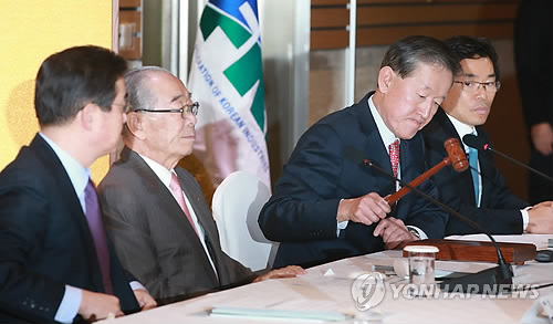 △ (서울=연합뉴스) 박동주 기자 = 10일 서울 여의도 전경련회관에서 회원 기업 대표 200여명이 참석한 가운데 열린 제54회 전국경제인연합회 정기총회에서 허창수 회장이 개회를 알리고 있다.