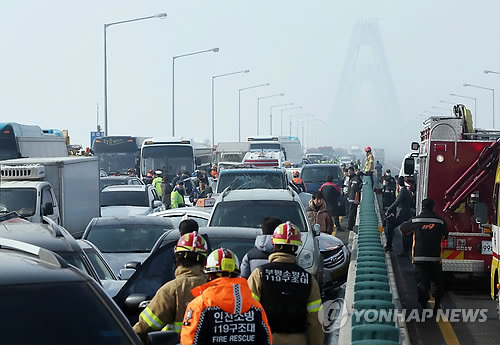이날 오전 9시 45분께에는 인천시 중구 영종대교 서울 방향 상부도로 12∼14km 지점에서 60여중 추돌사고가 발생했다. 이 때문에 현재 영종대교 상부도로 통행이 전면 통제되는 등 일대가 극심한 혼잡을 빚고 있다.