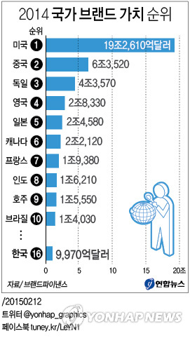 12일 영국 브랜드파이낸스가 발표한 '2014 국가 브랜드 연례보고서'를 보면 한국의 브랜드 가치는 2013년(7천750억 달러)보다 29% 증가했다.