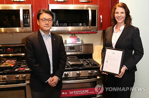 △ LG전자, 더블 오븐레인지 미국서 지속가능성 인증 획득 (서울=연합뉴스) LG전자는 프리미엄급 조리기기인 더블 오븐레인지 2종(LDG3036ST, LDE3037ST)이 미국가전제조사협회(AHAM)의 '지속가능성 인증'을 받았다고 11일 밝혔다. 앞서 LG전자는 2012년에는 냉장고, 2013년에는 세탁기 분야에서 지속가능성 인증을 받았다. LG전자 이태진 미국법인 HA담당(왼쪽)이 인증을 받은 제품 앞에서 포즈를 취하고 있다. 2015.2.12 << LG전자 제공 >> photo@yna.co.kr