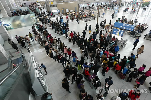 | △ 설 연휴 앞두고 붐비는 공항 (영종도=연합뉴스) 신준희 기자 = 설날을 일주일여 앞둔 12일 오전 영종도 인천국제공항 출국장이 여행객들로 붐비고 있다. |