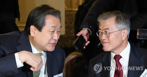 | △ 동창회에서 만난 양당대표 (서울=연합뉴스) 최재구 기자 = 새누리당 김무성 대표(왼쪽)와 새정치민주연합 문재인 대표가 11일 서울 광화문 세종문화회관에서 열린 경남중·고 동창회에 참석해 대화하고 있다. jjaeck9@yna.co.kr |