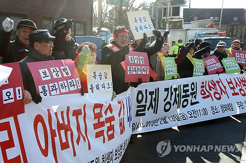| △ 일제 강제동원 희생자 보상 촉구 (서울=연합뉴스) 김주성 기자 = 일제 강제동원희생자 유가족들이 13일 오전 서울 종로구 청운효자동주민센터 앞에서 기자회견을 열어 국회에 계류 중인 일제 강제동원 희생자 보상법 통과를 요구하고 있다. 2015.2.13 utzza@yna.co.kr |