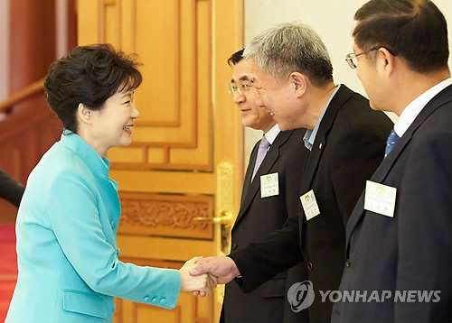 | △ 박 대통령, 노사정 대표 접견 (서울=연합뉴스) 박근혜 대통령이 13일 청와대에서 노사정 대표들과 오찬을 하기에 앞서 악수하고 있다. 오찬에는 김동만 한국노총 위원장과 김영배 한국경영자총협회 회장 직무대행, 김대환 경제사회발전 노사정위원장 및 최경환 경제부총리 겸 기획재정부 장관, 이기권 고용노동부 장관 등이 참석했다. (청와대 제공) |