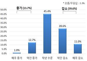 가계소득이 작년 수준을 유지할 것이라는 응답이 45.4%로 높은 가운데 작년보다 감소할 것(39.6%)이라는 답변이 증가할 것(13.7%)이라는 예측보다 많았다.
