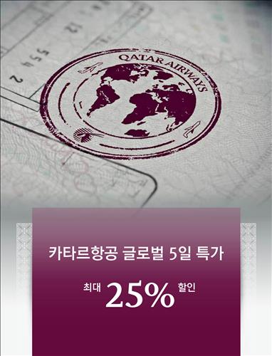 (서울=연합뉴스) 전준상 기자 = 카타르항공(www.qatarairways.com/kr)은 16일부터 20일까지 전체 노선의 비즈니스·이코노미 클래스 항공권을 최대 25% 할인 판매한다고 16일 밝혔다.