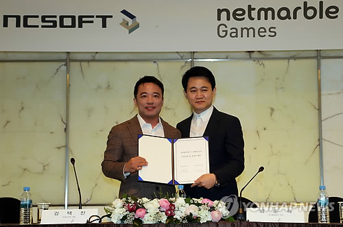 △ 전략적 제휴, 엔씨소프트-넷마블게임즈 (서울=연합뉴스) 최재구 기자 = 김택진 엔씨소프트 대표(왼쪽)과 방준혁 넷마블게임즈 의장이 17일 서울 중구 플라자호텔에서 열린 공동사업 및 전략적 제휴식에서 협약서를 들어보이고 있다.