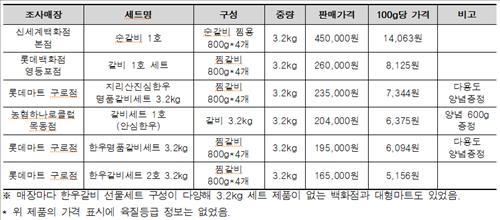 백화점에서 파는 3.2㎏ 세트 가격도 제품에 따라 제각각이었다. 롯데백화점 영등포점의 '갈비 1호 세트'가신세계 '순갈비 특호'보다 19만원 저렴한 26만원이다.