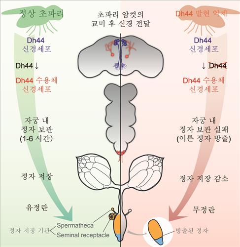 연구진은 초파리 유전자를 조작해 Dh44 등 신경펩타이드 45가지 생성되지 않도록 억제한 암컷을 대상으로 짝짓기 후 정자를 자궁에서 방출하기까지 걸리는 시간을 측정했다.