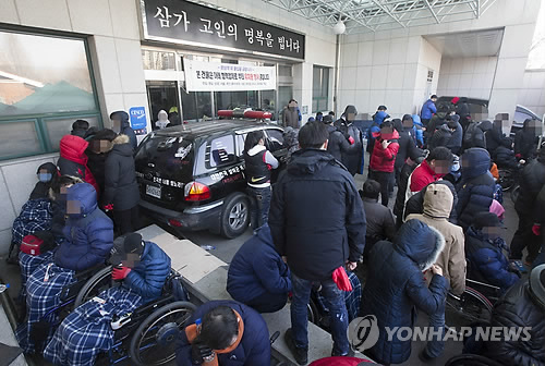 | △ (서울=연합뉴스) 윤동진 기자 = 중앙보훈병원 장례식장 명도집행이 실시된 지난 6일 서울 강동구 보훈병원 장례식장 앞에 명도집행에 반발한 대한민국상이군경회 신생특별회원들이 집결해있다. 2015.2.6 mon@yna.co.kr |