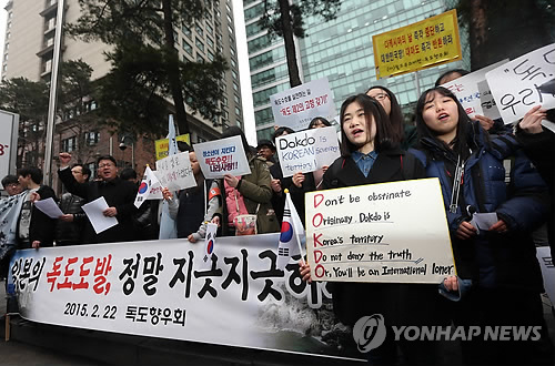 | △ '지긋지긋한' 일본의 독도 도발 (서울=연합뉴스) 신준희 기자 = 22일 오전 서울 종로구 일본대사관 앞에 모인 독도향우회 등 시민단체 회원들과 학생들이 일본의 '다케시마의 날' 행사를 비롯한 독도 도발을 규탄하는 기자회견을 하고 있다. 2015.2.22 hama@yna.co.kr |