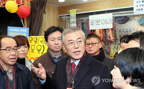 △ 설연휴 국제시장 찾은 문재인 대표 (부산=연합뉴스) 조정호 기자 = 새정치민주연합 문재인 대표가 설연휴 첫날인 18일 부산시 중구 국제시장 꽃분이네를 찾아 상인들과 대화하고 있다. 2015.2.18 ccho@yna.co.kr