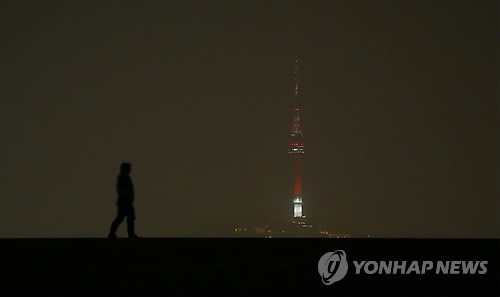 | △ 서울 황사경보, 붉어진 남산타워 (서울=연합뉴스) 신준희 기자 = 서울에 황사경보가 내려진 22일 밤 서울 용산구에서 바라본 남산 타워가 붉은 색으로 바뀐 채 희미하게 보이고 있다. 남산 N서울타워의 조명이 연두색 혹은 붉은색이면 미세먼지 농도가 45㎍/㎥ 초과되었다는 뜻이며, 해당 날에는 가급적 외출을 삼가고 부득이하게 외출 시 에는 마스크를 착용해야 한다. |