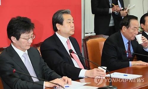 △ 새누리당 최고위원회의 (서울=연합뉴스) 진성철 기자 = 새누리당 유승민 원내대표(왼쪽 부터), 김무성 대표, 서청원 최고위원이 23일 국회에서 열린 최고위원회의에서 이정현 최고위원의 발언을 듣고 있다.