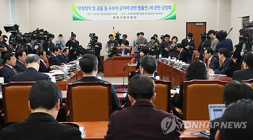 △ 국회, '김영란법' 공청회' (서울=연합뉴스) 진성철 기자 = 23일 국회 법제사법위원회에서 '부정청탁 및 금품 등 수수의 금지에 관한 법률안(일명 김영란법)에 대한 공청회'가 열리고 있다.