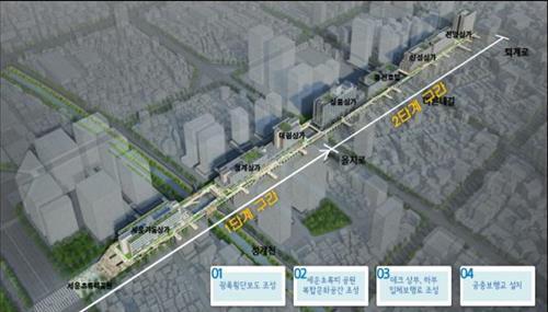 (서울=연합뉴스) 이정현 기자 = 청계천 복원 때 철거된 세운상가 가동과 청계상가 간 공중보행교가 다시 생긴다. 일대에 건널목, 보행데크, 엘리베이터도 설치돼 걸어서 종묘와 남산까지 닿게 된다.