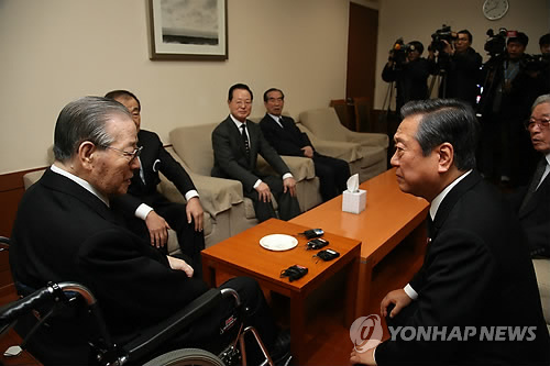 | △ JP 위로하는 오자와 이치로 (서울=연합뉴스) 양지웅 기자 = 오자와 이치로 일본 생활당 대표가 24일 오후 송파구 서울아산병원 장례식장에 마련된 김종필 전 국무총리의 부인 故 박영옥 씨의 빈소를 찾아 조문 후 김 전 총재를 만나 위로하고 있다. |