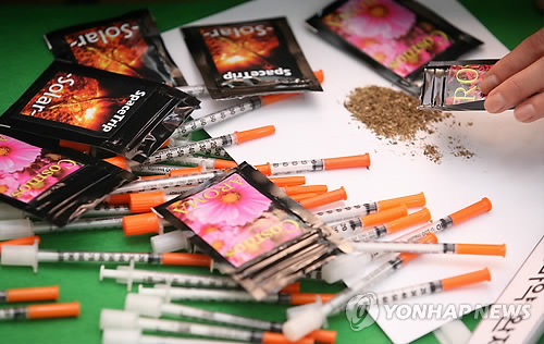 | △ '신종 허브마약' 중학생에게도 판매 (서울=연합뉴스) 임헌정 기자 = 일본에서 대량의 신종 허브마약 원료를 밀반입해 제조한 뒤 인터넷과 SNS를 통해 중·고등학생 등에게 팔아 온 피의자들이 검거됐다. 25일 서울 종로구 종로경찰서에서 서울경찰청 광역수사대 관계자들이 이들에게서 압수한 허브마약 완제품과 주사기 등을 공개하고 있다. 2015.2.25 kane@yna.co.kr |