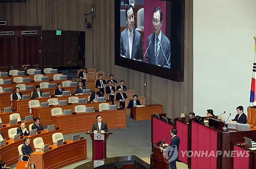 | △ 이완구 총리 답변 (서울=연합뉴스) 진성철 기자 = 이완구 국무총리가 25일 국회 본회의에서 진행된 정치외교안보통일 분야 대정부질문에서 새정치민주연합 이해찬 의원의 질의에 답변하고 있다. |