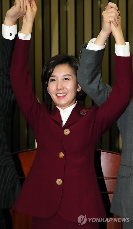 △ 새누리, 국회 외통위원장 후보로 나경원 선출 (서울=연합뉴스) 진성철 기자 = 국회 외교통일위원장 후보로 선출된 나경원 의원(가운데)이 26일 국회에서 열린 새누리당 의원총회에서 유승민 원내대표(오른쪽), 조해진 원내수석부대표와 손을 잡고 인사하고 있다. 2015.2.26 zjin@yna.co.kr