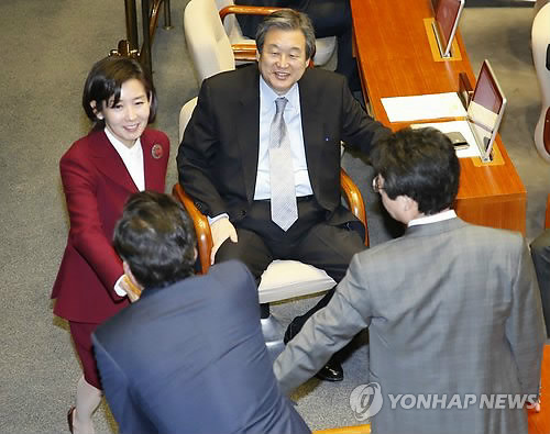 | △ 인사하는 나경원 외통위원장 (서울=연합뉴스) 이상학 기자 = 외교통일위원장에 선출된 새누리당 나경원 의원이 26일 국회 본회의에서 새누리당 김무성 대표 등과 인사를 하고 있다. |