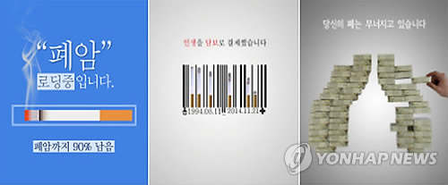 | △ '흡연경고그림 의무화 법안'이 국회 보건복지위원회 전체회의를 통과했다. 사진은 담뱃갑 경고그림 공모전 청소년·대학생·일반인 부문별 대상 수상작들. 왼쪽부터 안연수(광주서강고) 군의 작품 '그만 로딩을 멈추십시오', 대덕대 '도플갱어'팀의 '인생을 담보로 결제했습니다', 이주용(군인) 씨의 '당신의 폐는 무너지고 있습니다'..(보건복지부 제공) |