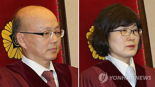 | △ 간통죄 위헌 선고…재판관들의 의견은? (서울=연합뉴스) 임헌정 기자 = 헌법재판소는 26일 간통을 처벌하도록 한 형법 제241조가 위헌이라고 선고했다. 헌법재판관 9명 중 7명이 위헌 의견을 내놨다. 왼쪽부터 합헌 의견을 낸 안창호, 이정미 재판관. |