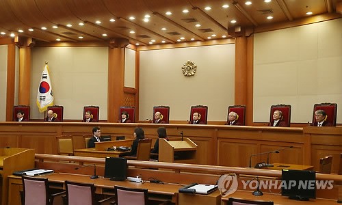 | △ 간통죄 62년 만에 폐지 (서울=연합뉴스) 임헌정 기자 = 박한철 헌법재판소장을 비롯한 헌법재판관들이 간통죄 위헌 여부 선고를 위해 26일 오후 서울 종로구 재동 헌법재판소 대심판정으로 들어선 뒤 자리에 앉아 있다. 헌재는 이날 간통을 처벌하도록 한 형법 제241조가 위헌이라고 선고했다. 헌법재판관 9명 중 7명이 위헌 의견을 내놨다. |