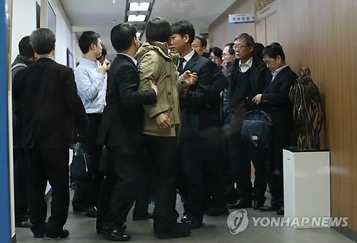 | △ 충돌 (서울=연합뉴스) 김도훈 기자 = 27일 새벽 서울 광화문 원자력안전위원회에서 전체회의가 끝난 뒤 표결 결과에 항의하는 방청객과 이를 제지하는 관계자들이 충돌을 빚고 있다. |
