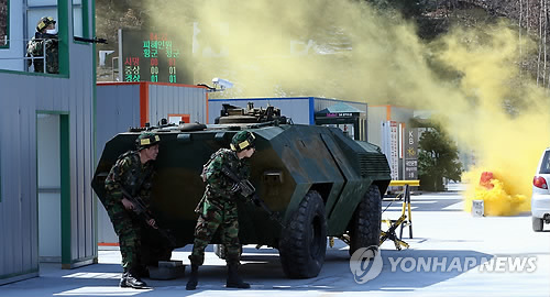 | △ 남양주 금곡예비군훈련대에서 예비군들이 모의교전장비(마일즈) 전술훈련을 하고 있다. (연합뉴스 자료사진) |