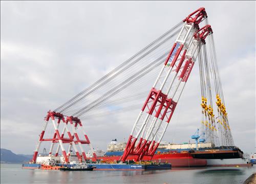 길이 182m, 폭 70m 규모의 이 크레인은 2013년 10월 현대삼호중공업에서 착공한 지 1년 4개월 만에 완성돼 내달 현대중공업 울산 본사로 옮겨져 이르면 4월부터 해양플랜트 건조작업에 투입된다.