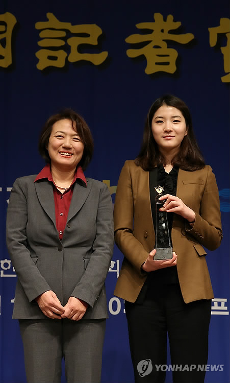 △ 제46회 한국기자상 시상식 (서울=연합뉴스) 이지은 기자 = 10일 오전 서울 중구 프레스센터에서 열린 제46회 한국기자상 시상식에서 연합뉴스 이슬기 기자(오른쪽)가 취재보도부문을 수상한 후 기념촬영을 하고 있다. 2015.2.10 jieunlee@yna.co.kr