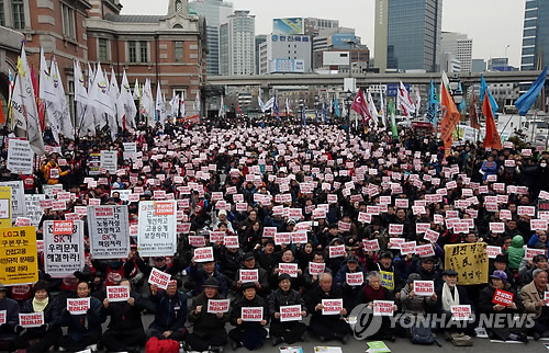 | △ '민주파괴 민생파탄 평화위협 범국민대회' (서울=연합뉴스) 박동주 기자 = 28일 오후 서울역 광장에서 민중의 힘 등 시민단체 주최로 열린 '민주파괴 민생파탄 평화위협 범국민대회'에서 참가자들이 구호를 외치고 있다. 2015.2.28 pdj6635@yna.co.kr |