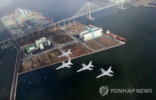 | △ 최초 국산전투기 FA-50 편대 3·1절 기념비행 (서울=연합뉴스) 최초의 국산전투기 공군 FA-50 편대가 평택항과 서해대교 상공에서 광복 70주년 3·1절 기념비행을 하고 있다. (공군 제공) |