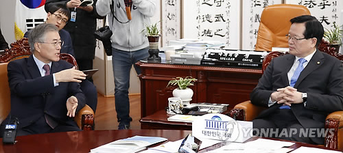선거 제도가 헌법과 관련이 많다는 문 대표의 의견에 "(두 개가) 물려 있다"고 동의한 정 의장은 "개헌 특위를 별개로 만들지는 여야 대표가 논의해볼 만하다"고 화답했다.
