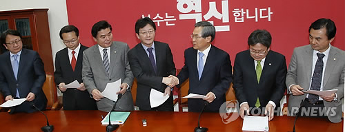 | △ '김영란법' 처리 합의 악수하는 여야 원내대표 (서울=연합뉴스) 이상학 기자 = 새누리당 유승민 원내대표와 새정치민주연합 우윤근 원내대표 등이 2일 오후 국회에서 김영란법(부정청탁 및 금품 등 수수금지법) 본회의 처리 등에 합의한 뒤 악수를 하고 있다.왼쪽부터 새누리당 이종훈 의원, 새누리당 조해진 원내수석부대표, 새누리당 원유철 정책위의장, 새누리당 유승민 원내대표, 새정치민주연합 우윤근 원내내표, 새정치민주연합 강기정 정책위의장, 새정치민주연합 안규백 원내수석부대표. 2015.3.2 leesh@yna.co.kr |