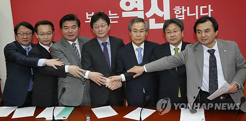 | △ '김영란법' 처리 합의 여야 원내지도부 (서울=연합뉴스) 이상학 기자 = 새누리당 유승민 원내대표와 새정치민주연합 우윤근 원내대표 등이 2일 오후 국회에서 김영란법(부정청탁 및 금품 등 수수금지법) 본회의 처리 등에 합의한 뒤 포즈를 취하고 하고 있다.왼쪽부터 새누리당 이종훈 의원, 새누리당 조해진 원내수석부대표, 새누리당 원유철 정책위의장, 새누리당 유승민 원내대표, 새정치민주연합 우윤근 원내내표, 새정치민주연합 강기정 정책위의장, 새정치민주연합 안규백 원내수석부대표. 2015.3.2 leesh@yna.co.kr |