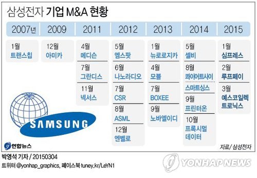 작년 8월 미국의 사물인터넷 개방형 플랫폼 개발업체 스마트싱스를 인수한 것은 삼성전자의 M&A 행보에 속도를 더했다. 삼성전자는 작년 8∼10월 3개월 사이에 북미 지역 4개 업체를 인수했다.