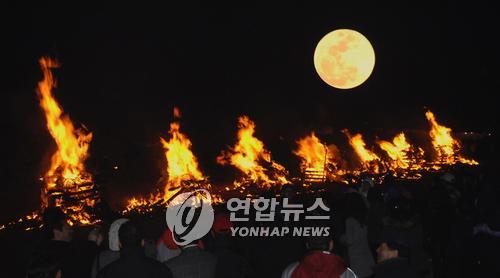 | △ 제주도에서 열린 정월대보름 행사에서 도민과 관광객들이 대보름달 아래서 달집을 태우며 소원을 빌고 있다. (연합뉴스 자료사진) |