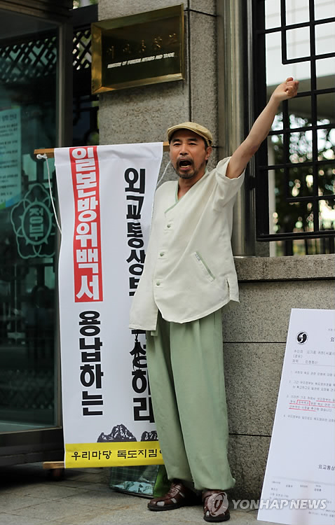 △ 리퍼트 주한미국대사 습격 피의자 김기종 씨 (서울=연합뉴스) 마크 리퍼트 주한미국대사가 5일 오전 7시 40분께 세종문화회관 세종홀에서 열린 민족화해협력범국민협의회(민화협) 주최 조찬 강연회 장소에서 강의를 준비하는 도중 진보 성향 문화운동 단체인 우리마당 대표 김기종 씨로부터 흉기로 얼굴과 왼쪽 손목 부위를 공격당했다. 사진은 지난 2010년 외교통상부 앞에서 일본의 독도영유권 주장에 반대하는 1인 시위를 하는 김기종 씨. 김 씨는 시게이에 도시노리 주한 일본대사에게 돌을 던져 징역2년, 집행유예 3년을 선고받은 바 있다.