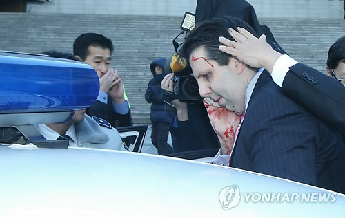 | △ 괴한 공격당한 마크 리퍼트 주한 미 대사 (서울=연합뉴스) 김주성 기자 = 마크 리퍼트 주한 미대사가 5일 오전 서울 세종문화회관에서 열린 민화협 주최 초청 강연에 참석했다가 괴한의 공격을 받고 피를 흘리며 병원으로 향하고 있다. |