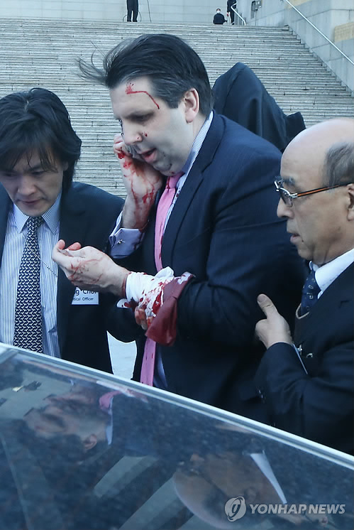 | △ 괴한 공격당한 마크 리퍼트 주한 미 대사 (서울=연합뉴스) 김주성 기자 = 마크 리퍼트 주한 미대사가 5일 오전 서울 세종문화회관에서 열린 민화협 주최 초청 강연에 참석했다가 괴한의 공격을 받고 피를 흘리며 병원으로 향하고 있다. 2015.3.5 utzza@yna.co.kr |