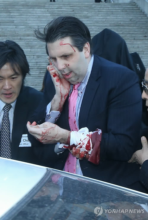 | △ 괴한 공격당한 마크 리퍼트 주한 미 대사 (서울=연합뉴스) 김주성 기자 = 마크 리퍼트 주한 미대사가 5일 오전 서울 세종문화회관에서 열린 민화협 주최 초청 강연에 참석했다가 괴한의 공격을 받고 피를 흘리며 병원으로 향하고 있다. 2015.3.5 utzza@yna.co.kr |