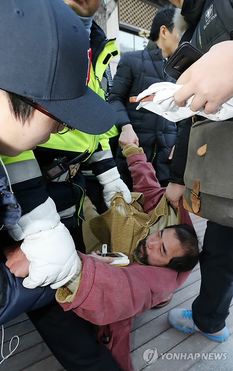 | △ 경찰에 제압당한 리퍼트 미 대사 습격 괴한 (서울=연합뉴스) 윤동진 기자 = 5일 오전 서울 세종문화회관에서 열린 민화협 주최 초청 강연에서 마크 리퍼트 주한 미국대사를 습격한 용의자가 경찰차로 이송되고 있다. |