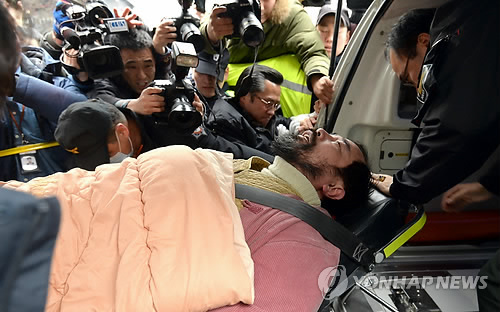 △ 병원으로 이송되는 김기종씨 (서울=연합뉴스) 한종찬 기자 = 마크 리퍼트 주한 미국대사를 습격한 김기종씨가 지난 5일 오전 서울 종로경찰서에서 들것에 누운 채 병원으로 이송되고 있다.