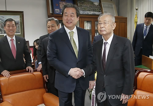 | △ 백선엽 장군 만난 김무성 대표 (서울=연합뉴스) 이상학 기자 = 새누리당 김무성 대표가 6일 용산구 전쟁기념관을 방문, 백선엽 장군과 인사를 하고 있다. |