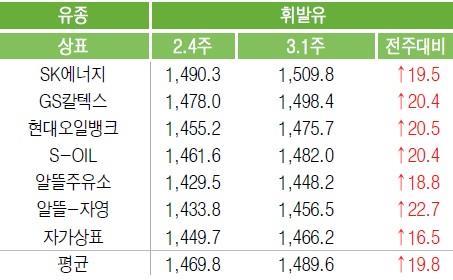 하지만 2월 둘째주 ℓ당 4.5원 반등하더니, 셋째주 30.9원, 넷째주 22.1원 오른데 이어 이번주까지 4주 내리 오름세를 보였다.
