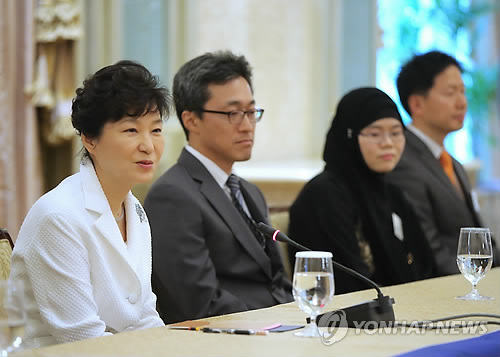 | △ 박 대통령, UAE 한인 의료인 간담회 (아부다비=연합뉴스) 이정훈 기자 = 박근혜 대통령이 6일 오후(현지시간) 아랍에미리트(UAE) 아부다비 한 호텔에서 UAE 한인 의료인과 간담회를 갖고 있다. |